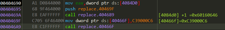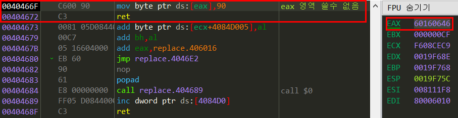 그리고 그다음 404690으로 점프한 후 eax=입력값+(0x4)+(0x601605C7) 이되고, [4048d0]은 +0x1이 한번 더되고 [40466f]가 특정 값으로 채워진다. 그리고 나서 이상한게 'call 40466f'이다.