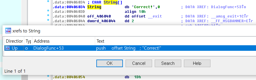 어떤 주소인지는 Correct가 어떻게하면 실행이 될까와 연관지어 생각하면 된다. (이래놓고 사실 난 삽질을 엄청 많이했다...ㅋㅋ) Correct로 가기 직전에 jmp문이 2개가 있기 떄문에 뭔가 이 jmp문 주소가 eax가 되게하면 되는데 일단 테스트를 위해 eax에 비어있는 쓸수 있는 주소 아무거나 줘봤다.