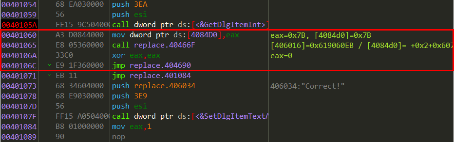 입력값을 123(0x7B)으로 주고 입력값을 입력받아서 eax에 저장하는 GetDigItemInt 호출 이후부터 좀 살펴보면 404690으로 점프하기 전까지 결국 [4084d0]= 입력값+(0x4)+(0x601605C7) 이되고 eax=0 으로 초기화, [406016]이 특정 값으로 채워진다.